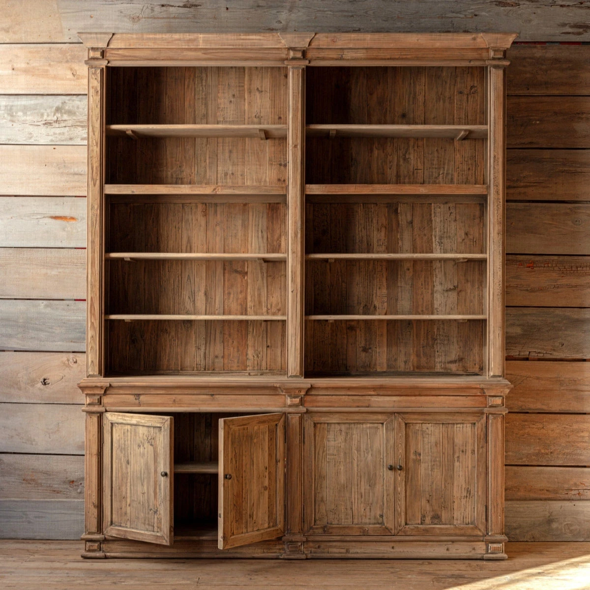 The Eldermere Pine Library is a grand nod to tradition, reimagined for modern life. Handcrafted from old pine with all the knots, grooves, and weathered character left intact, its double-wide silhouette features adjustable open shelving above and concealed storage below.