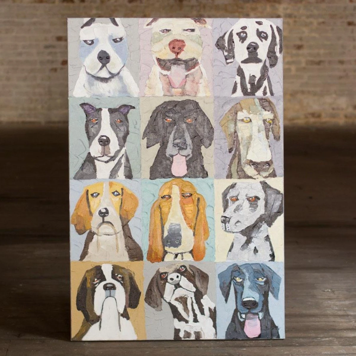 Despite their forlorn expressions, it’s hard not to laugh at some of their distinguishing features! A dozen dogs in varying states of concern about missing toys and later-than-usual dinner times. Oil on canvas.