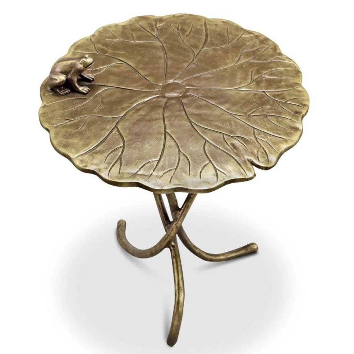 An expressive end table featuring metallic lily pads and aquatic foliage that support the shared eco-system of a frog and a dragonfly. A bit over twenty five inches tall; aluminum.